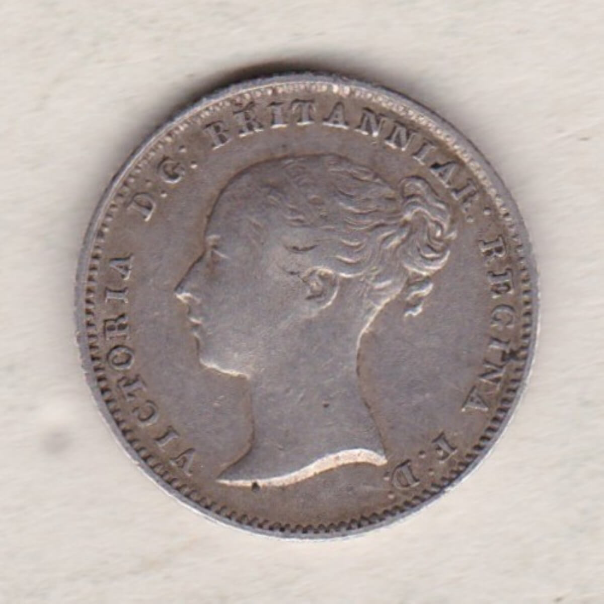 The 1848 over 6 fourpence / groat is a coin struck in 0.925 silver by the Royal Mint. This coin went by a few different names, Fourpence, Groat, Fourpenny bit or Joey. Between 1836 and 1888 these coins were issued as currency coins. Maundy fourpence coins were also issued during these years.