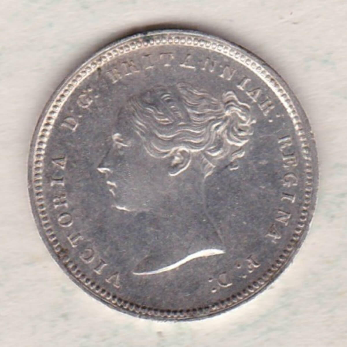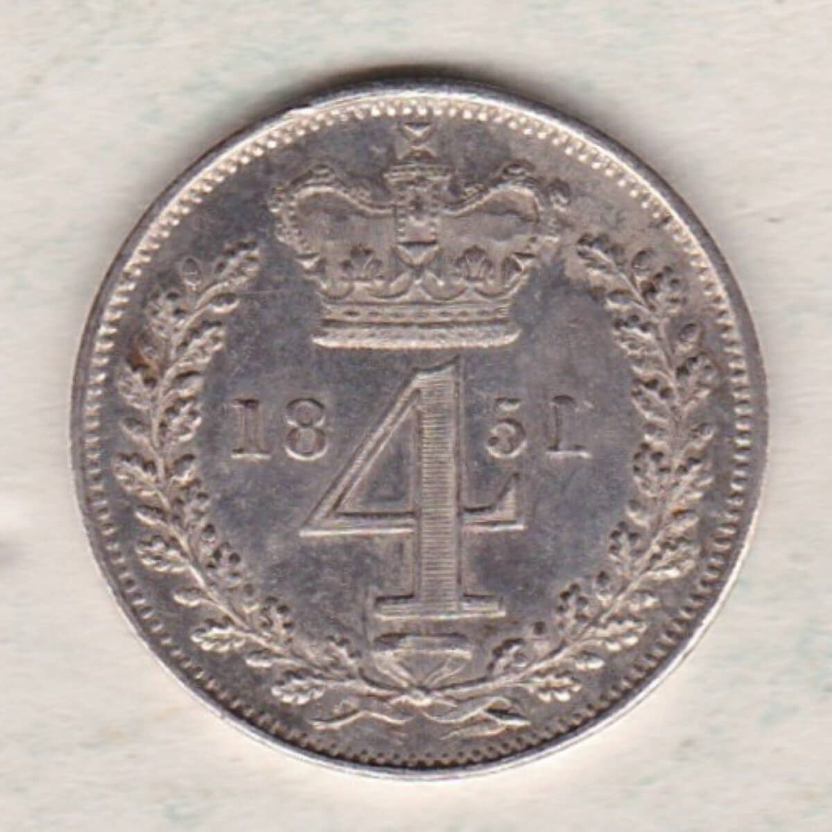 The 1851 maundy fourpence is a coin struck in 0.925 silver by the Royal Mint. The Obverse features the young uncrowned portrait (‘Young Head’) of Queen Victoria facing left, with legend around. The Reverse of this coin depicts a crowned denomination dividing date within an oak wreath.