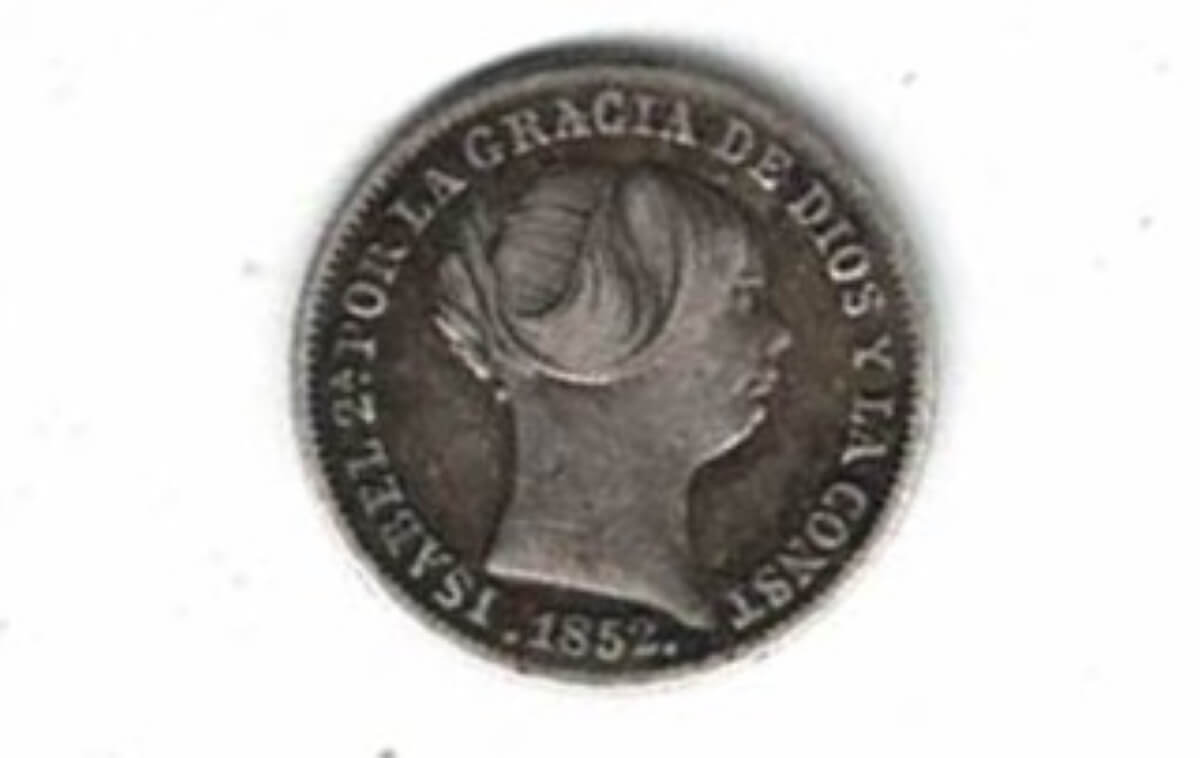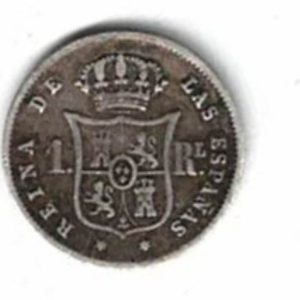 1852 Spain Silver One Real Coin. The obverse features the bust of Queen Elizabeth II. The reverse features the crowned coat of arms of Spain.1852 Spain Silver One Real Coin