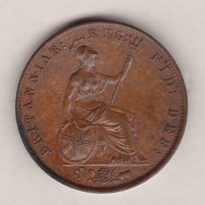 The 1853 halfpenny was struck in copper by the Royal Mint. The obverse side of the coin features a young Queen Victoria with her head facing left, hair in a double fillet, and a loose curl. The truncation on the neck has the engraver’s initials, W.W. for William Wyon, and the date below. The reverse side of the coin depicts Britannia seated facing right holding a trident and resting her right hand on a shield. A rose, thistle, and shamrock are united in the exergue.