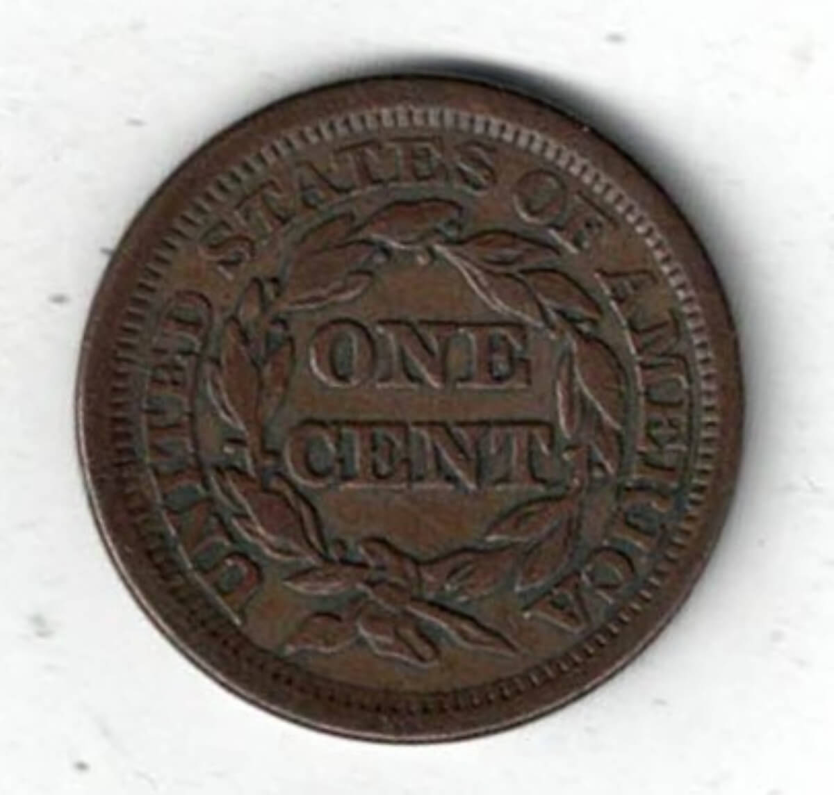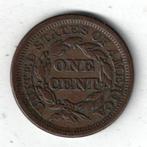 This 1853 one cent coin was minted in Philadelphia. The Obverse features the liberty head facing left. The reverse features the value within wreath.