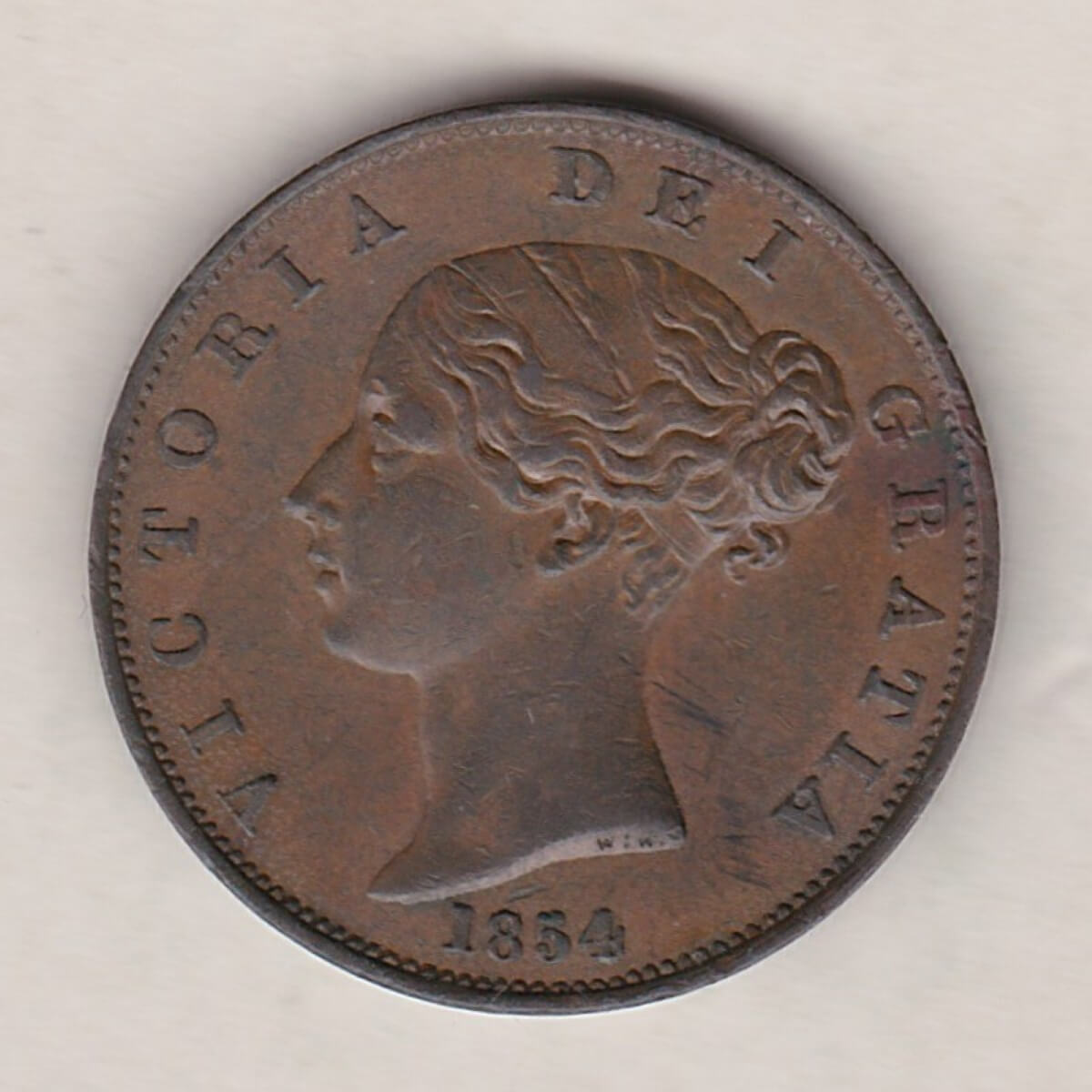 The 1854 halfpenny was struck in copper by the Royal Mint. The obverse side of the coin features a young Queen Victoria with her head facing left, hair in a double fillet, and a loose curl. The truncation on the neck has the engraver’s initials, W.W. for William Wyon, and the date below. The reverse side of the coin depicts Britannia seated facing right holding a trident and resting her right hand on a shield. A rose, thistle, and shamrock are united in the exergue.
