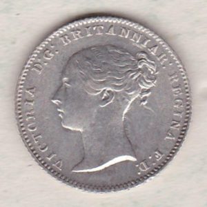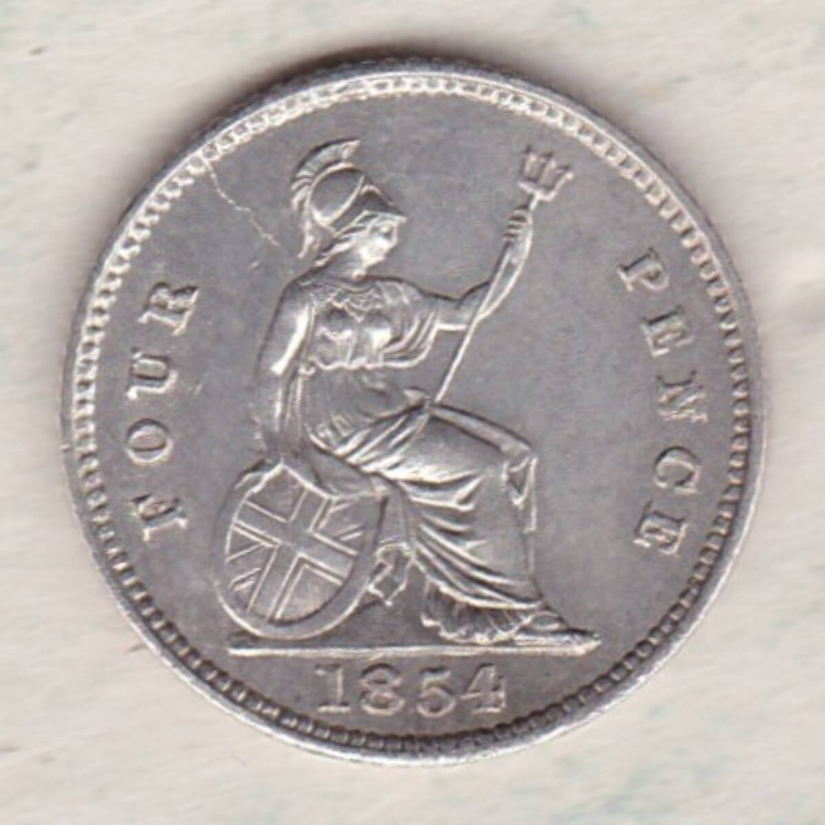 The 1854 fourpence / groat is a coin struck in 0.925 silver by the Royal Mint. This coin went by a few different names, Fourpence, Groat, Fourpenny bit or Joey. Between 1836 and 1888 these coins were issued as currency coins. Maundy fourpence coins were also issued during these years.