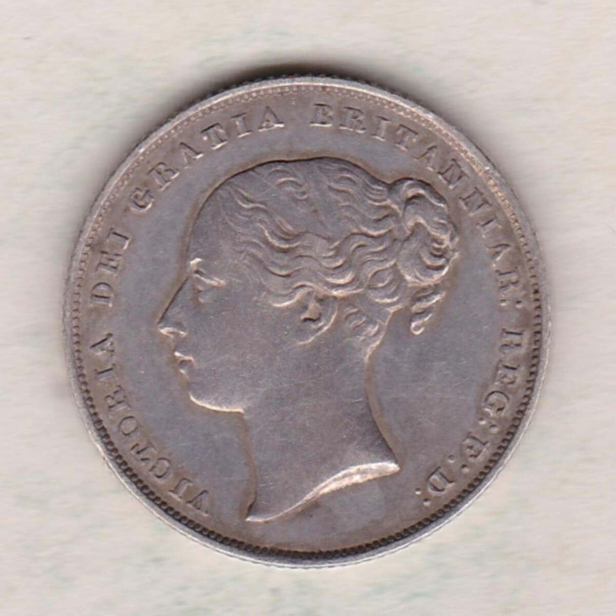 The Young head Shilling is a coin struck in 0.925 silver by the Royal Mint. This second type of the Young head design of Queen Victoria was used on the Obverse of the Shilling between 1839 and 1867. The Reverse of this coin depicts a crown, laurel and oak leaves within an open wreath, and the words “ONE / SHILLING” and “1855”.