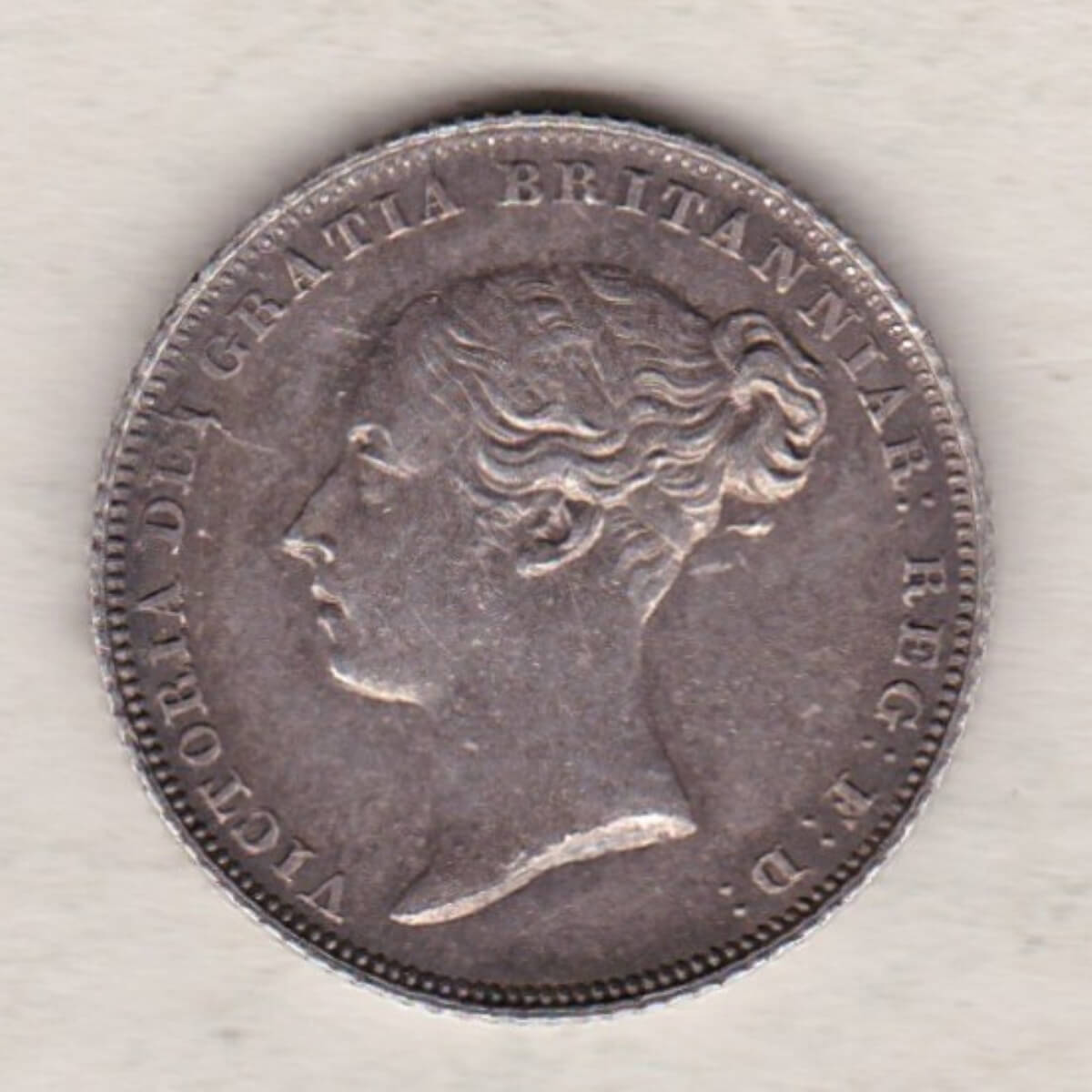 This Young head Sixpence is a coin struck in 0.925 silver by the Royal Mint.  This first type of the Young head design of Queen Victoria was used on the Obverse of the Sixpence between 1838 and 1866.  The Reverse features a crowned denomination within a wreath and date below.