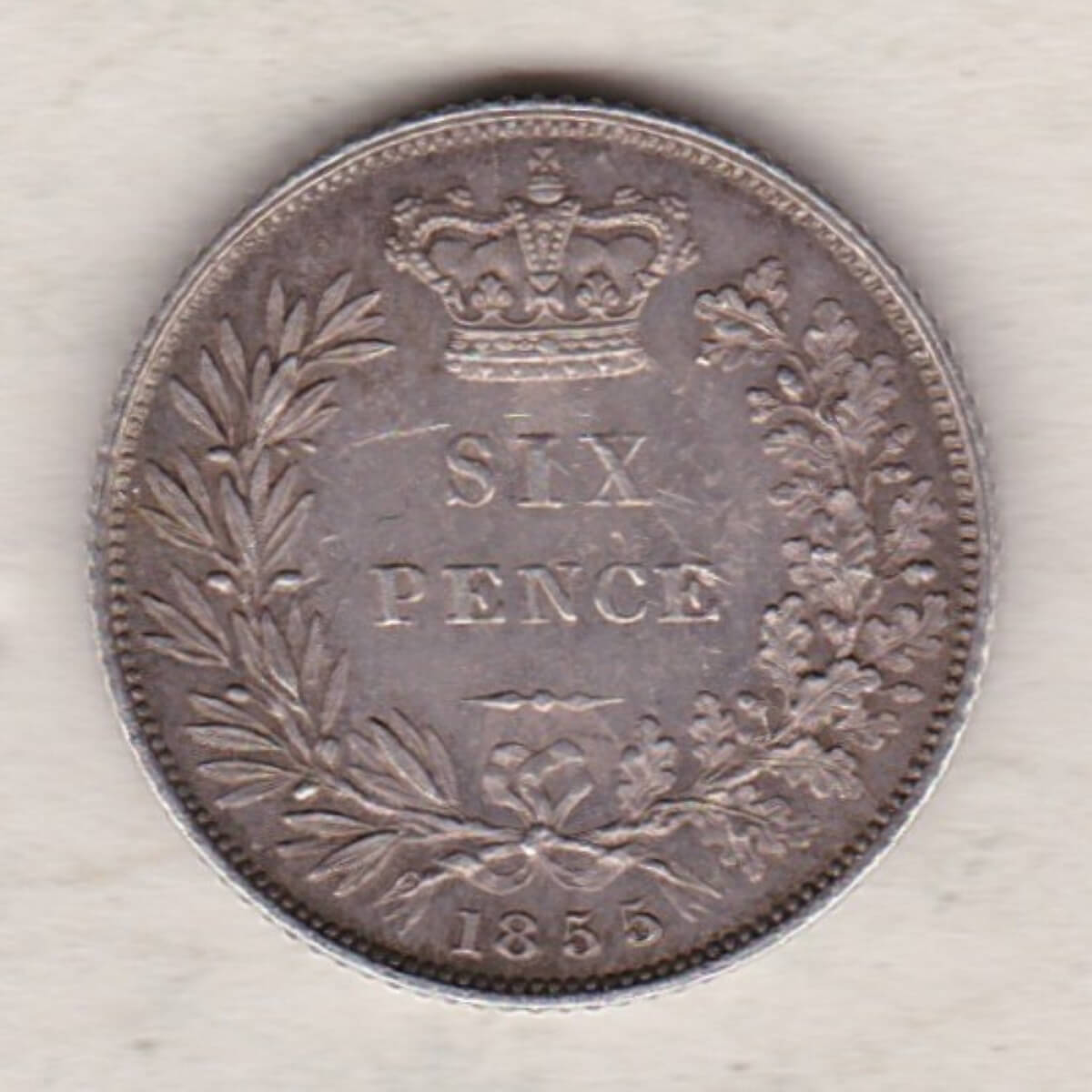 1855 silver sixpence coin featuring young head Queen Victoria on the Obverse. The crowned denomination within a wreath and date below on the Reverse.1855 Silver Sixpence – Victoria Young Head