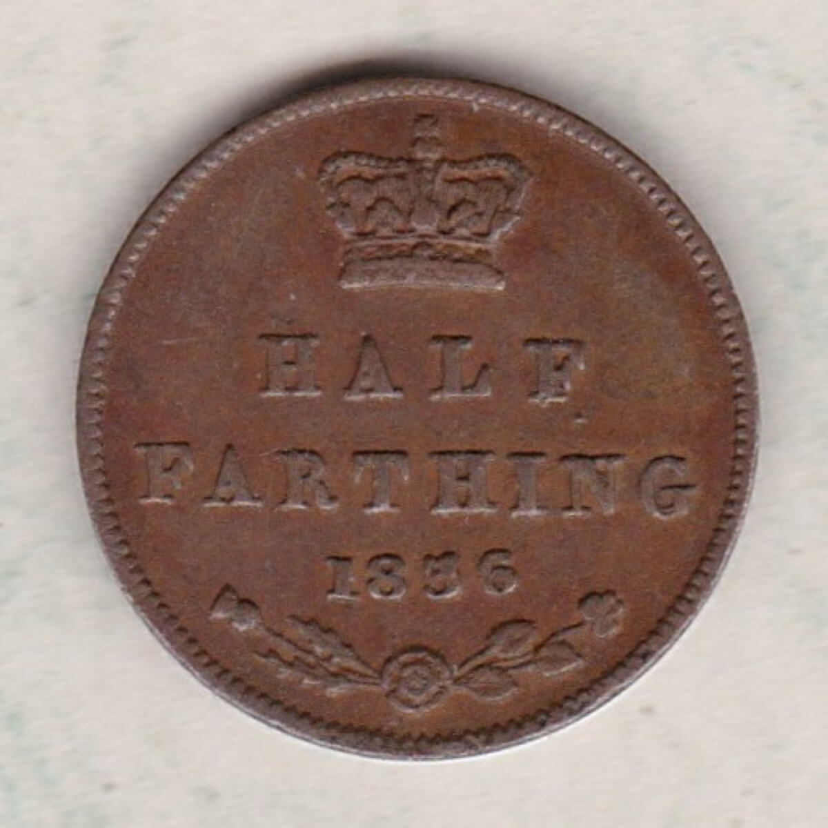 The 1856 Half Farthing is a coin struck in copper by the Royal Mint. The obverse features the first uncrowned portrait of Queen Victoria facing left with legend around, this early image of Queen Victoria is often referred to as the young head design. The reverse has a central crowned denomination with the date underneath. There is a rose, thistle and shamrock below the date.
