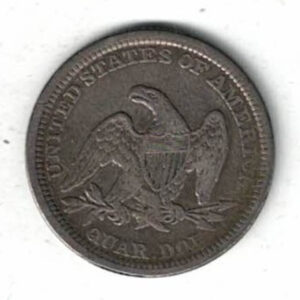 This 1856 silver Quarter Dollar coin was minted in Philadelphia. The Obverse features a seated liberty looking right above her shoulder. The reverse features an eagle with arrows and olive branch in talons.