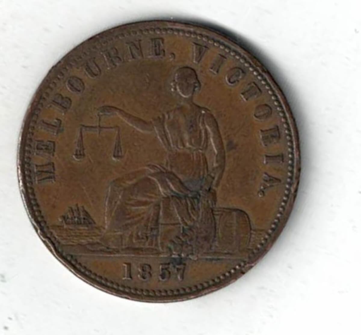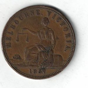 1857 Australia Melbourne Hide And De Carle Copper Penny Token. The obverse features a lion with lettering around. The reverse features a women with scales.1857 Australia Melbourne Hide And De Carle Copper Penny Token
