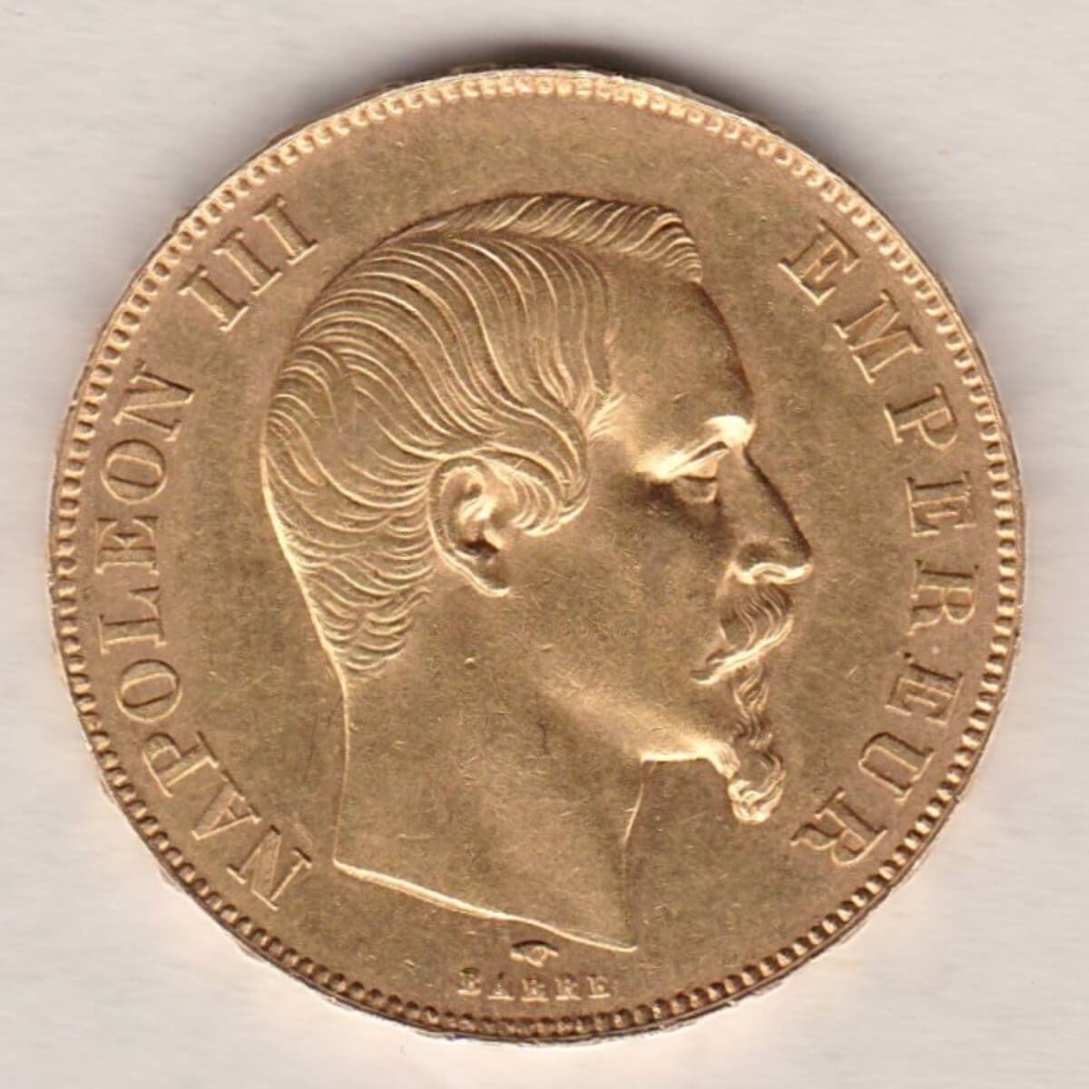 This 1858 French gold coin was minted in Paris. The obverse features Napoleon III, the emperor is facing right “Napoléon III” is inscribed on the left and “empereur” on the right. In the lower middle of the piece, the engraver’s signature (Barre). A crowned and mantled arms divide the denomination. The date is below with the A indicating the Paris mint.
