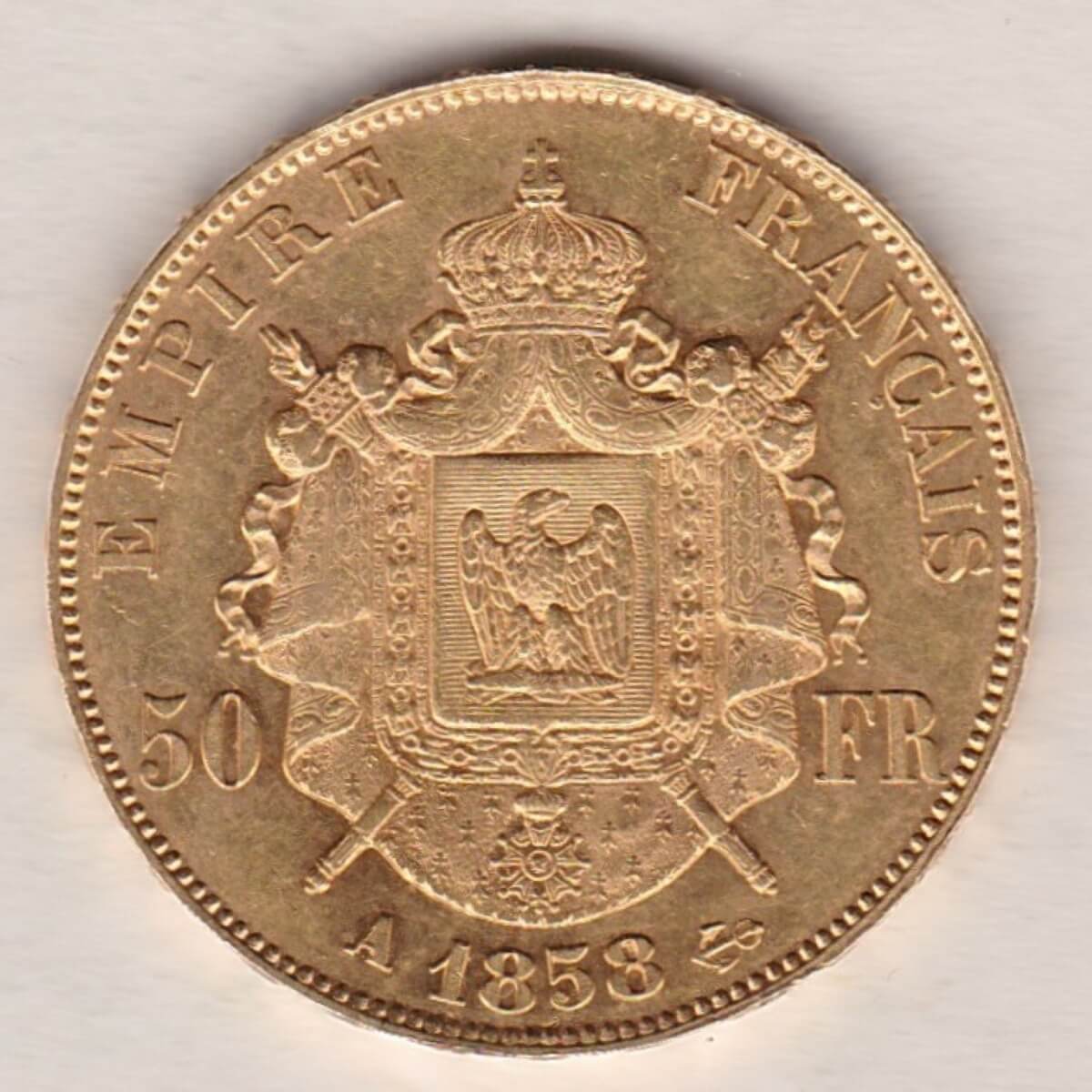 The 1858 A gold Fifty Francs coin was struck in Paris, France and had a mintage of 85,000.
