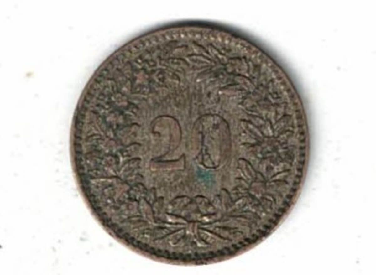 1858 B Switzerland Billon Twenty Rappen Coin. The obverse features the coat of arms of Switzerland with shield, acorns and oak branches. 1858 B Switzerland Billon Twenty Rappen Coin