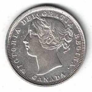 1858 Canada Silver Twenty Cent Coin. The obverse side of the coin features the young head of Queen Victoria facing left. All coins are in stock.1858 Canada Silver Twenty Cent Coin