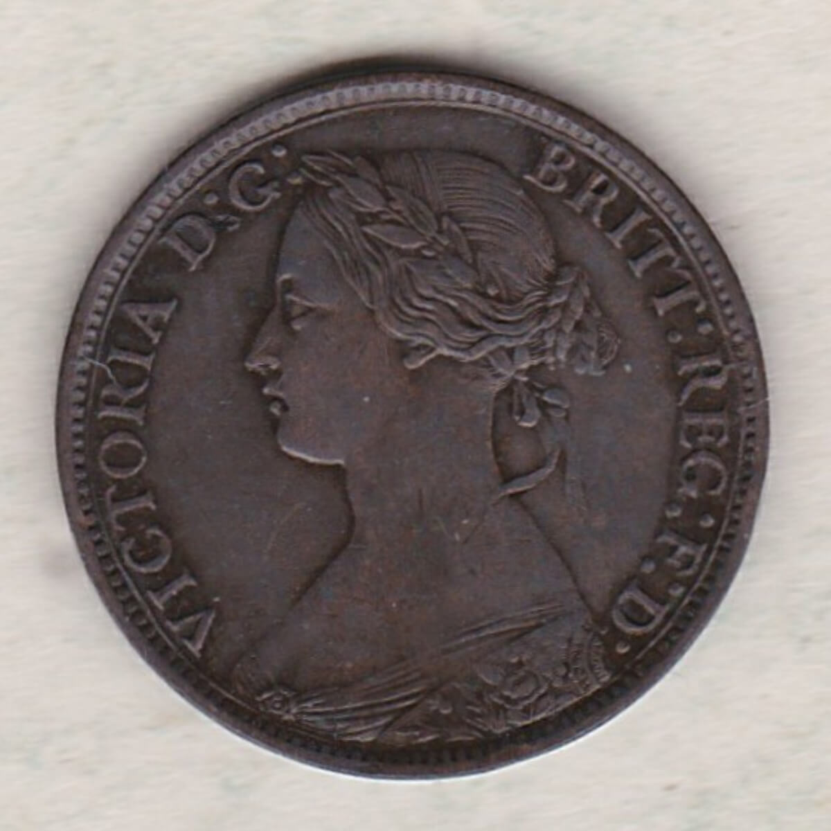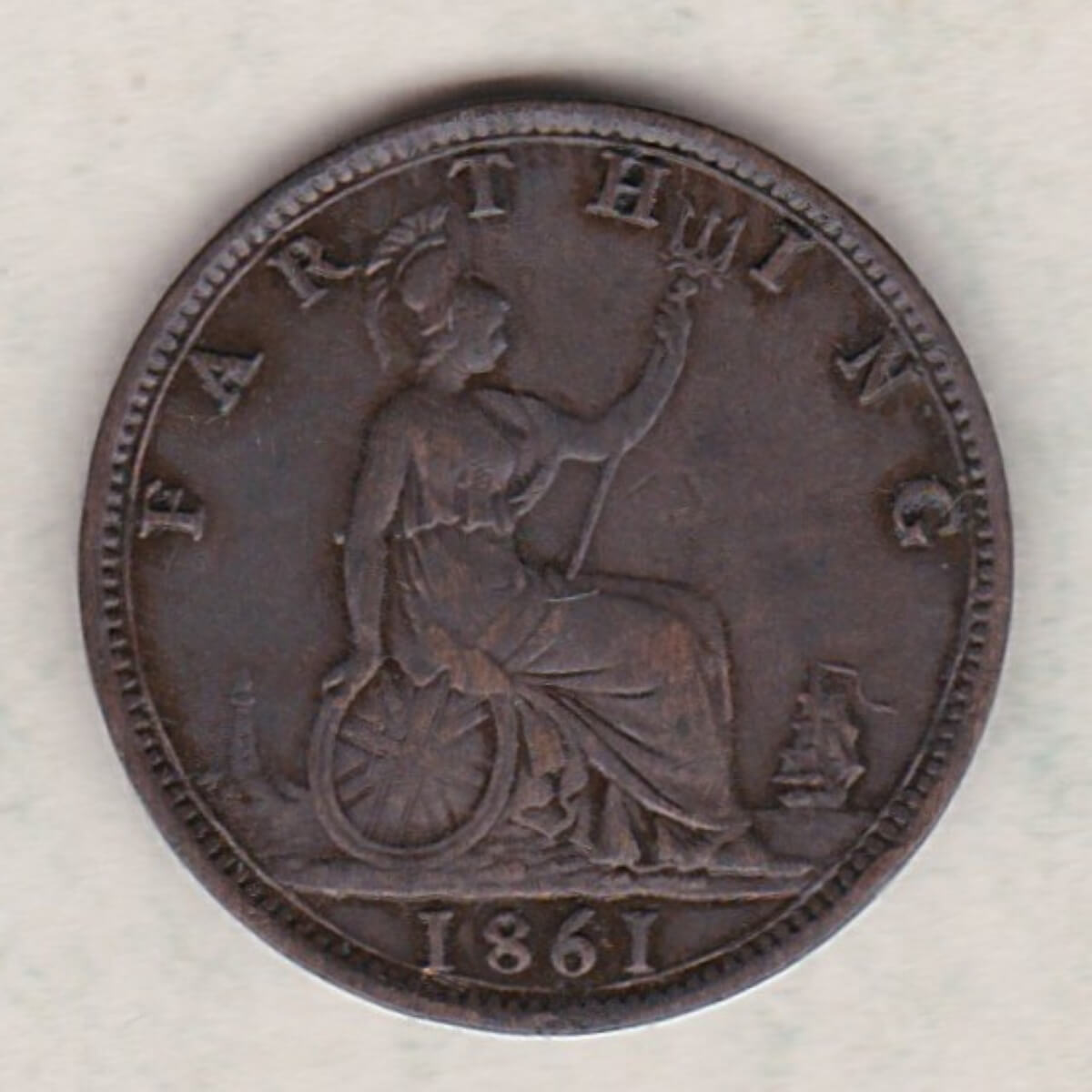 The 1861 farthing was struck in bronze by the Royal Mint.  The obverse side of the coin features the second laureate portrait (‘Bun Head’) of Queen Victoria facing left, with legend around.  The reverse side of the coin depicts a seated figure of Britannia facing right, trident in left hand, shield with Union flag in right hand, denomination above, date in exergue, sea behind with lighthouse on left and ship on right.