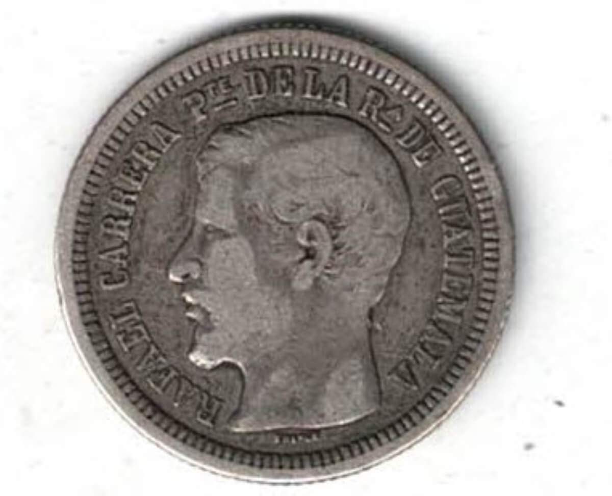The obverse features the bust of Rafael Carrera. The reverse features the coat of arms with value and date at bottom.
