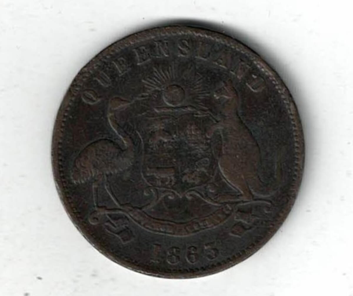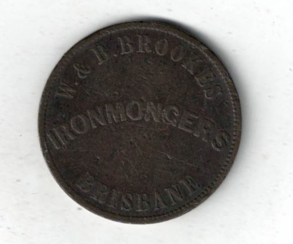 The obverse features the lettering W & B Brookes, Ironmongers, Brisbane, Melbourne. The reverse features the coat of arms.