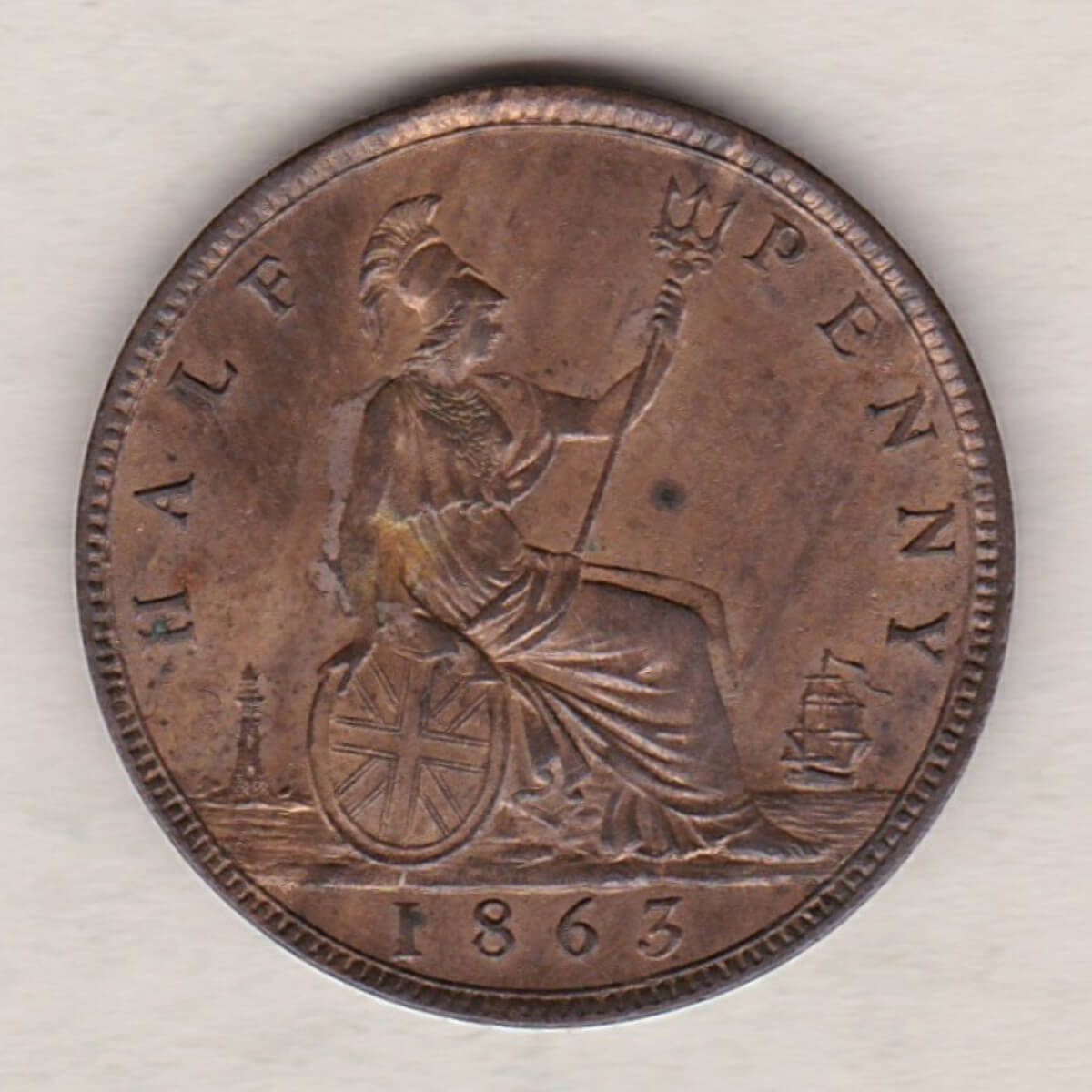 The 1863 halfpenny was struck in bronze by the Royal Mint. The obverse side of the coin depicts the young bust of Queen Victoria wearing a bodice, mantle, and circular brooch, with her hair in a bun and decorated with a wreath of leaves and berries. The reverse side of the coin depicts Britannia seated to the right, the denomination around, with date in exergue, and sea behind.