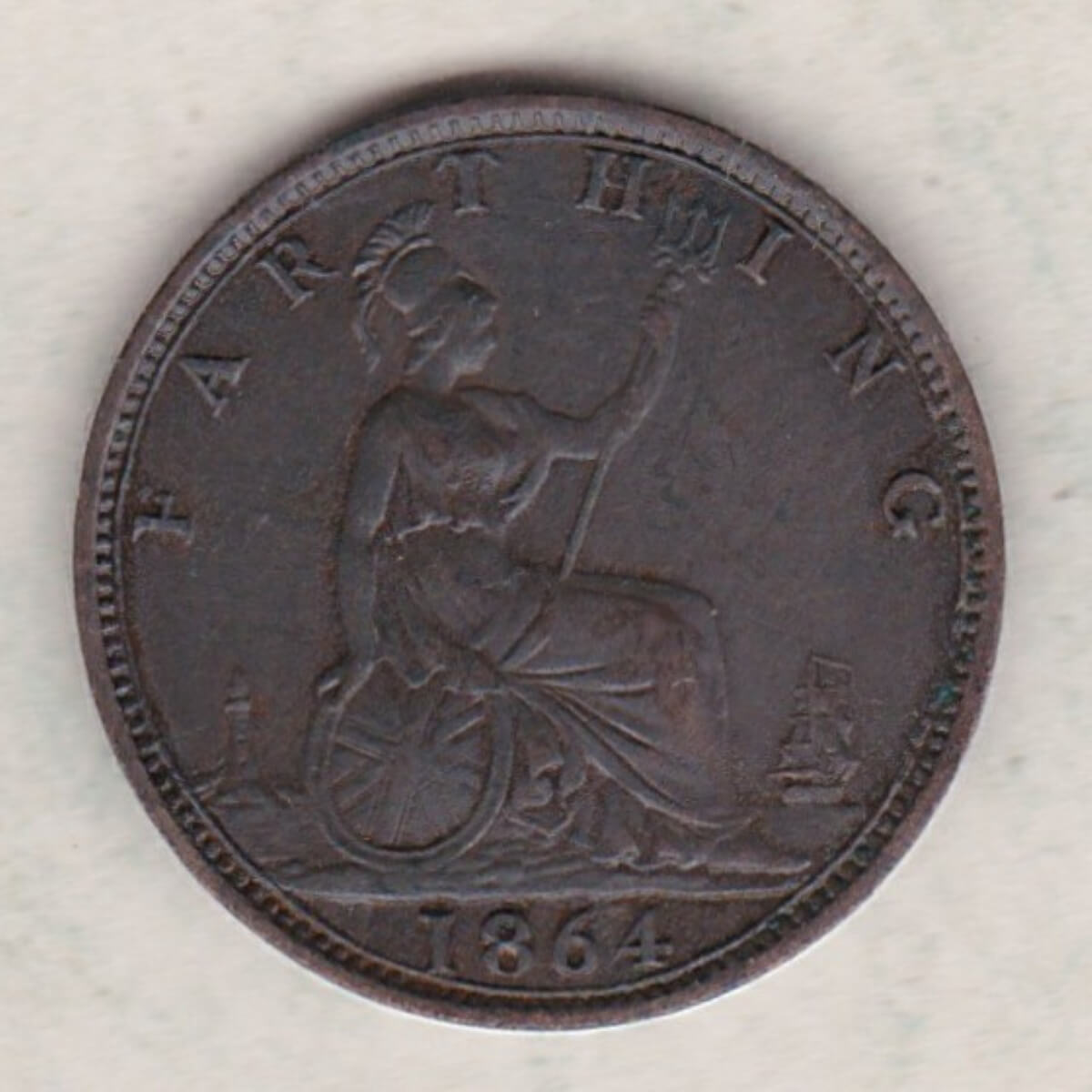 The 1864 farthing was struck in bronze by the Royal Mint. The obverse side of the coin features the second laureate portrait (‘Bun Head’) of Queen Victoria facing left, with legend around. The reverse side of the coin depicts a seated figure of Britannia facing right, trident in left hand, shield with Union flag in right hand, denomination above, date in exergue, sea behind with lighthouse on left and ship on right.
