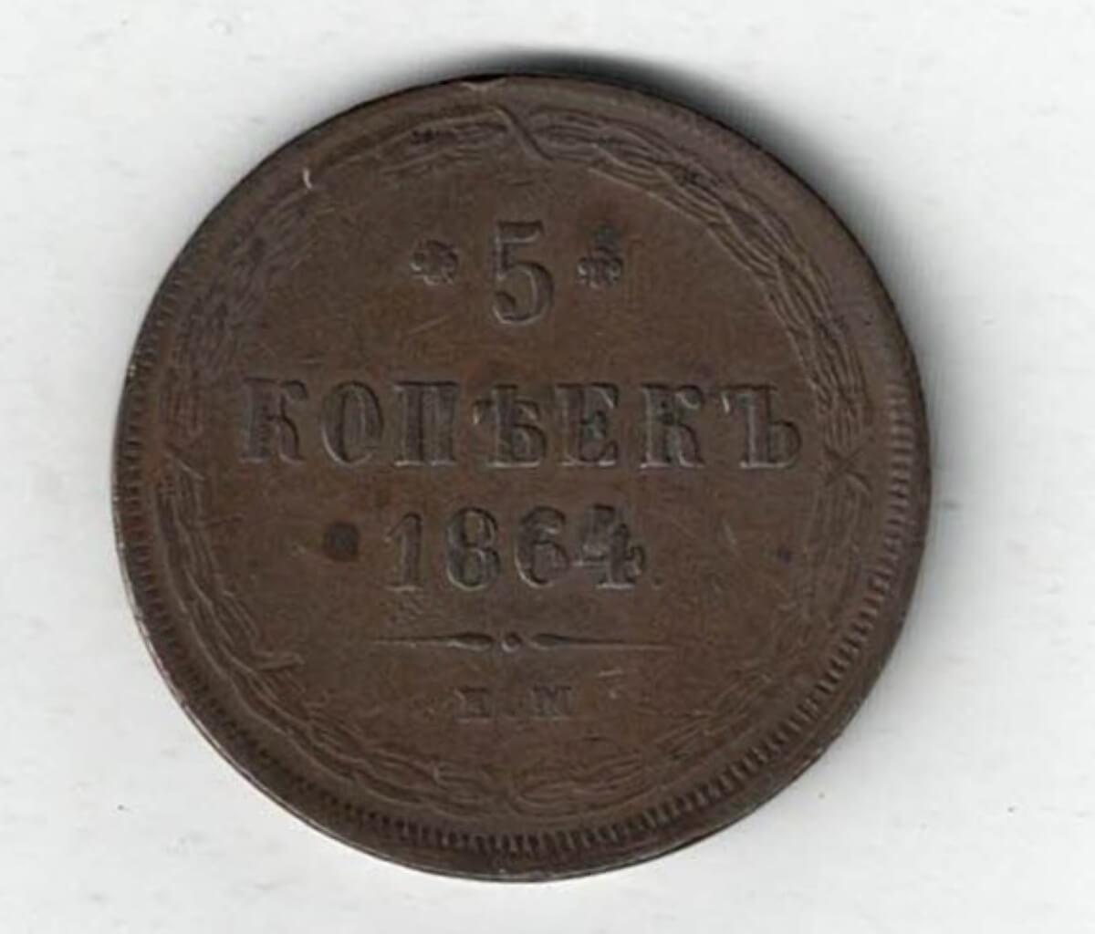 1864 E.M. Russia Copper Five Kopecks Coin