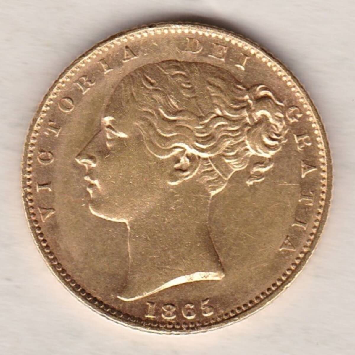 The obverse of the 1865 gold sovereign coin features a large, young portrait of Queen Victoria facing left. The portrait was designed by William Wyon, the Chief Engraver, and shows Victoria at the age of 18 with her hair in a loose bun held by a double fillet. The initials “W.W.” are also incuse on the truncation, with the date appearing below the portrait. The reverse of this coin features a shield design by engraver Jean Baptiste Merlen.