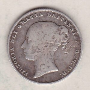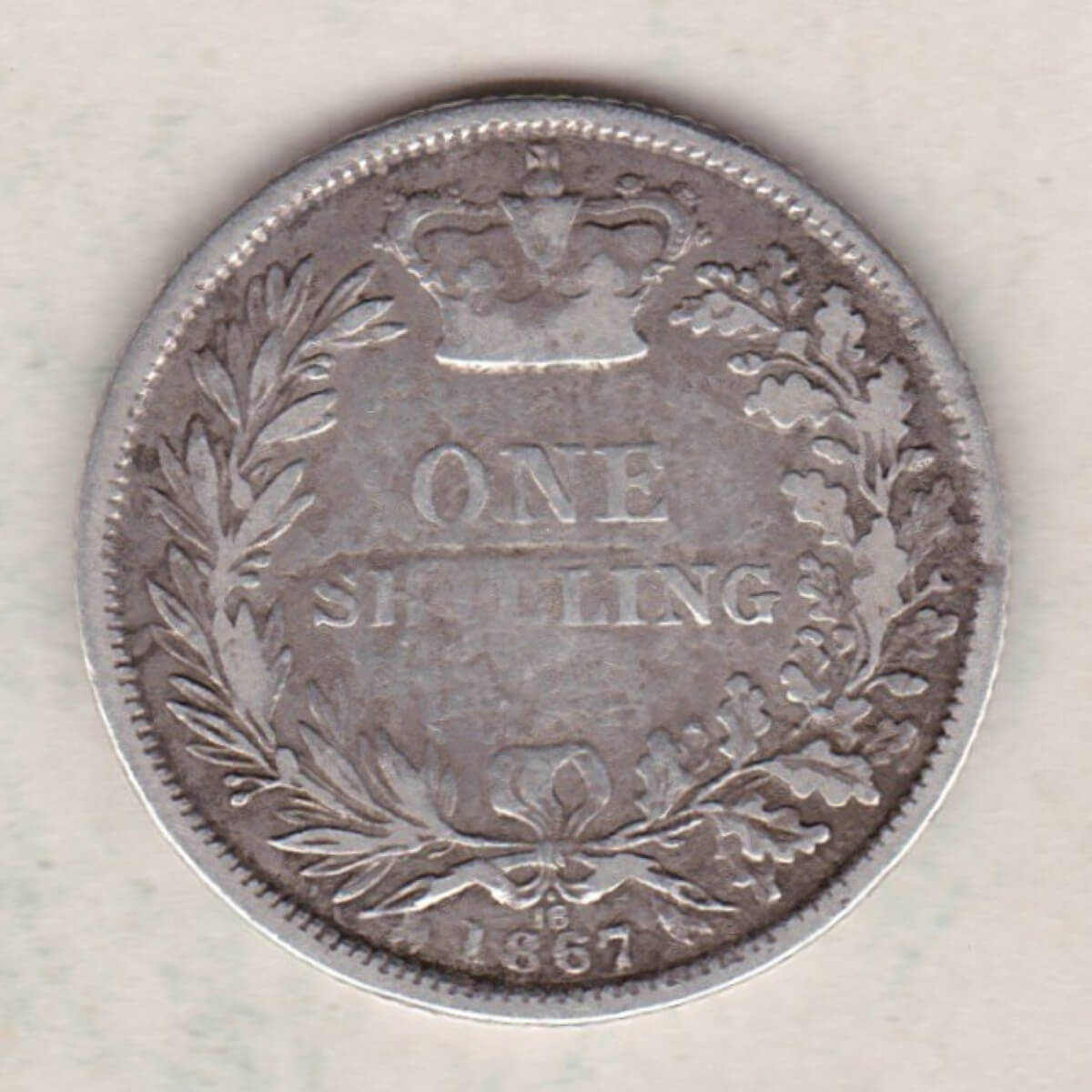 1867 silver shilling coin featuring Queen Victoria young head on the Obverse. The Reverse has a crown, laurel and oak leaves within an open wreath.1867 Silver Shilling – Victoria Young Head