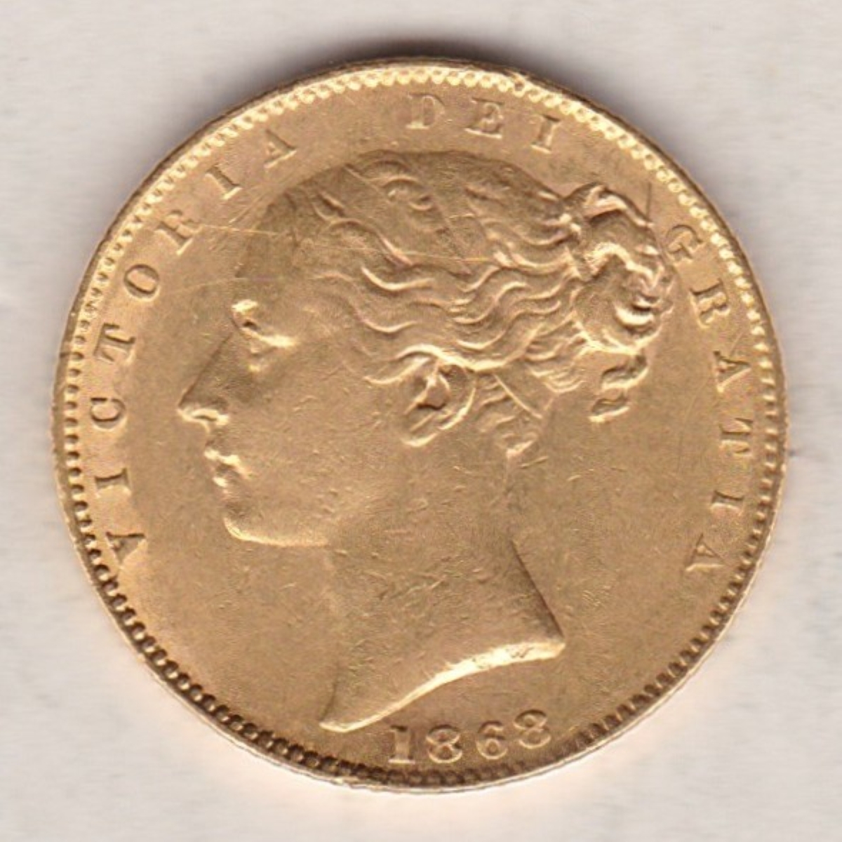 The obverse of the 1868 gold sovereign coin features a large, young portrait of Queen Victoria facing left. The portrait was designed by William Wyon, the Chief Engraver, and shows Victoria at the age of 18 with her hair in a loose bun held by a double fillet. The initials “W.W.” are also incuse on the truncation, with the date appearing below the portrait. The reverse of this coin features a shield design by engraver Jean Baptiste Merlen.