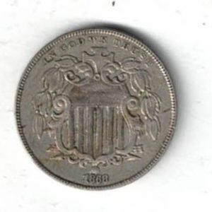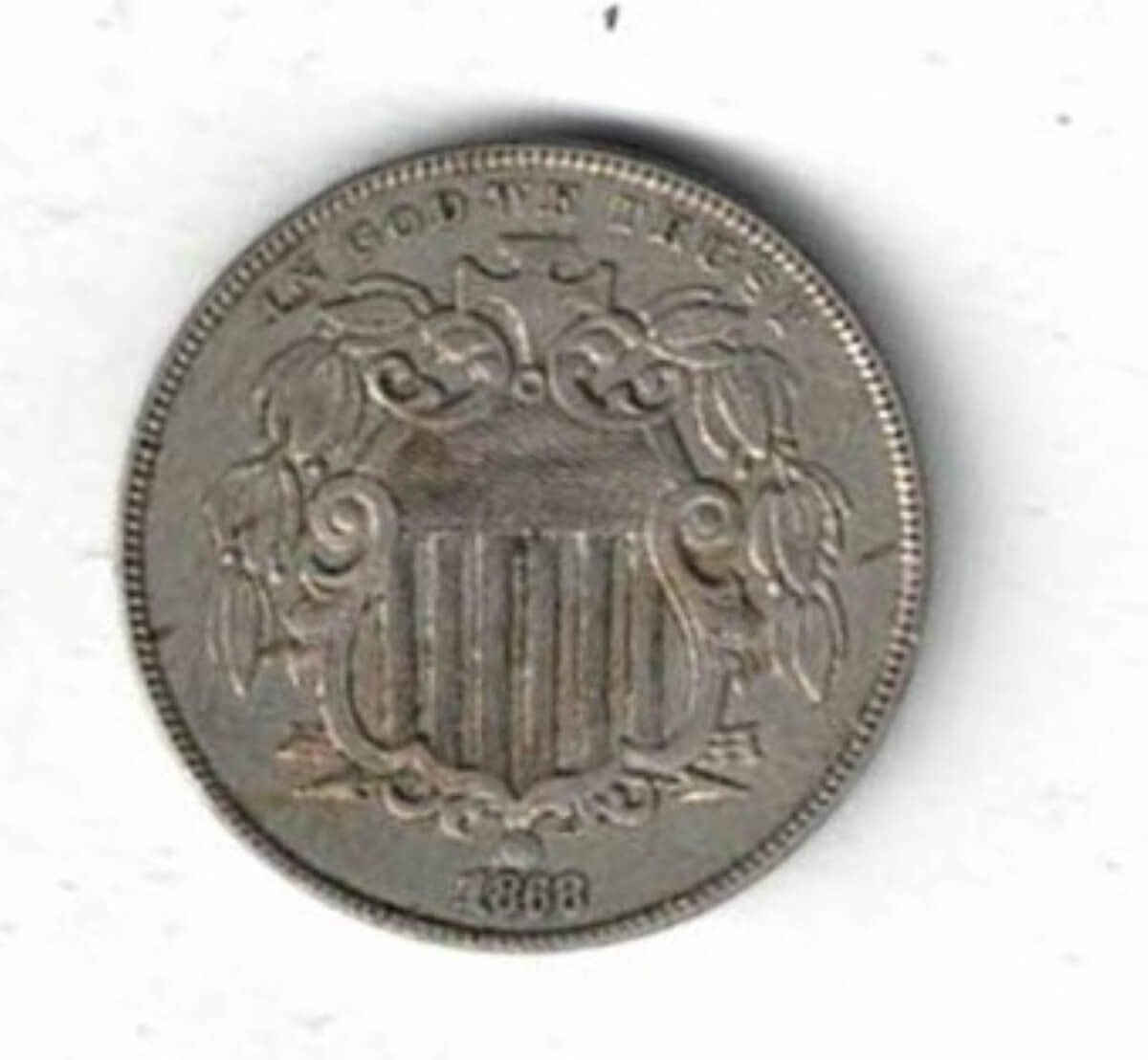 1868 USA Shield Nickel Five Cents Coin in Good Fine Condition.