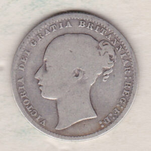 The Young head Shilling is a coin struck in 0.925 silver by the Royal Mint. This third type of the Young head design of Queen Victoria was used on the Obverse of the Shilling between 1867 and 1879. The Reverse of this coin depicts a crown, laurel and oak leaves within an open wreath, and the words “ONE / SHILLING” and “1869” with die number 9 above the date.