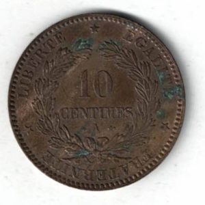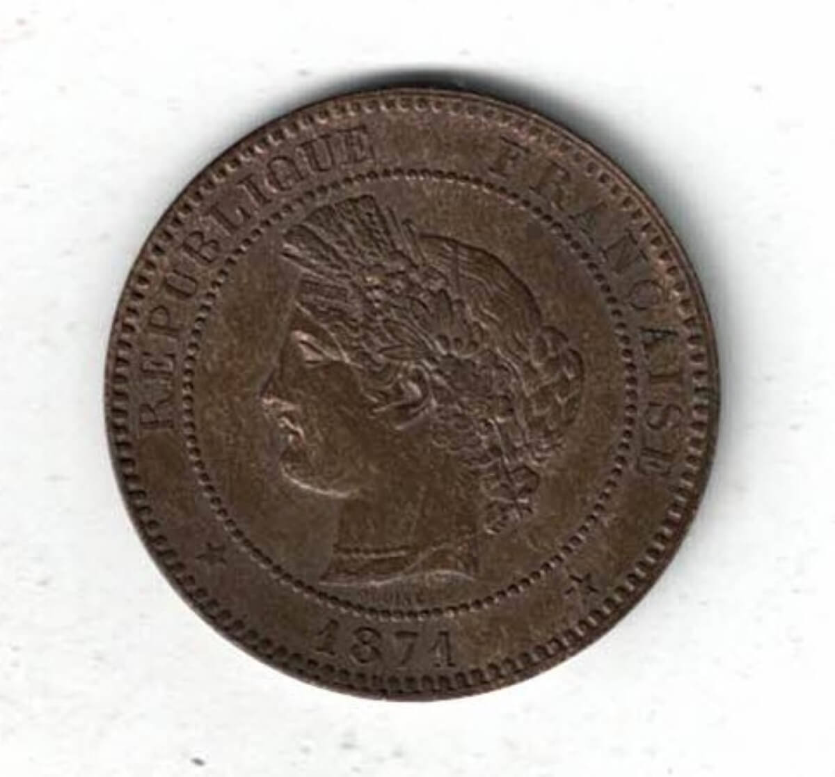 1871 A France Bronze Ten Centimes Coin. The obverse features the head of the Republic on the left as Ceres. The reverse features a wreath with value.1871 A France Bronze Ten Centimes Coin