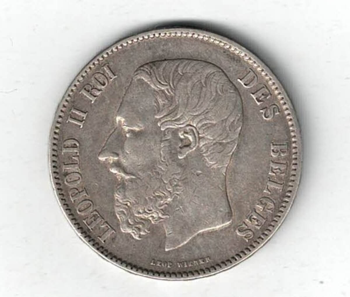 1871 Belgium Silver Five Francs Coin. The obverse features Leopold II facing left. The reverse features Crowned arms on ornate shield divide denomination.1871 Belgium Silver Five Francs Coin
