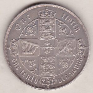 1871 Silver Gothic Florin Coin. The Obverse features a crowned bust of Queen Victoria. The Reverse features a shield with denomination.1871 Silver Gothic Florin Coin
