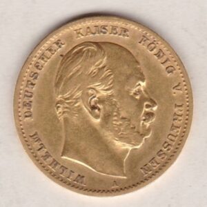 This 1872 German gold coin has the A – Berlin mint.  The obverse features Wilhelm I, German Emperor and King of Prussia, facing right, with the mint mark beneath. The reverse features the crowned imperial eagle, with the denomination and date below.