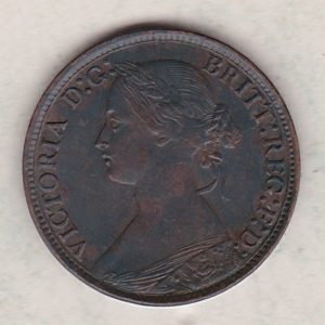 The 1872 farthing was struck in bronze by the Royal Mint. The obverse side of the coin features the second laureate portrait (‘Bun Head’) of Queen Victoria facing left, with legend around. The reverse side of the coin depicts a seated figure of Britannia facing right, trident in left hand, shield with Union flag in right hand, denomination above, date in exergue, sea behind with lighthouse on left and ship on right.