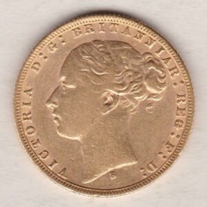 The 1874 sovereign was struck in 22 carat gold. The obverse features the young portrait of Queen Victoria facing left, the S – Sydney, Australia mint mark can be seen below the bust of the Queen. The reverse depicts St George slaying the dragon, with the date in exergue.