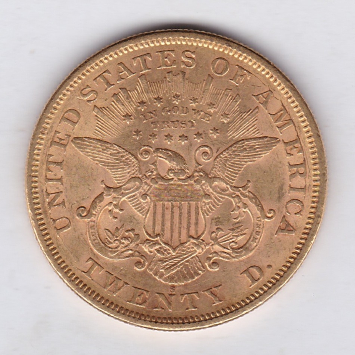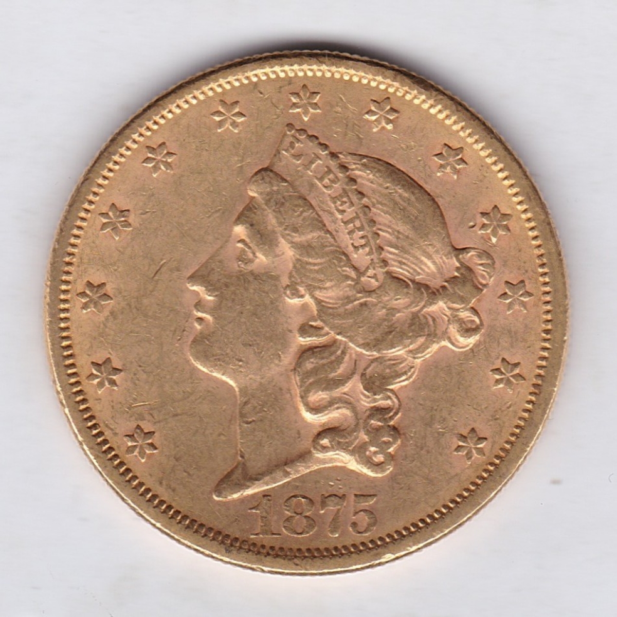 The 1875 S USA gold Twenty Dollars coin was struck in San Francisco and had a mintage of 1,230,000.
