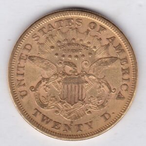 The 1875 gold twenty dollar coin was minted in San Francisco and is also known as the Coronet Liberty double eagle. The Obverse features a left-facing coronet head of Lady Liberty surrounded by 13 stars and the date below her neck. The coronet is inscribed with the word “Liberty”. The Reverse design has an eagle with a shield on its chest, the motto “In God We Trust” encircled by stars, and the denomination “Twenty D” along the bottom edge. The S – San Francisco mint mark can be found between the shield and the denomination.