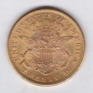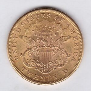 The 1876 gold twenty dollar coin was minted at the San Francisco mint and is also known as the Coronet Liberty double eagle. The Obverse features a left-facing coronet head of Lady Liberty surrounded by 13 stars and the date below her neck. The coronet is inscribed with the word “Liberty”. The Reverse design has an eagle with a shield on its chest, the motto “In God We Trust” encircled by stars, and the denomination “Twenty D” along the bottom edge