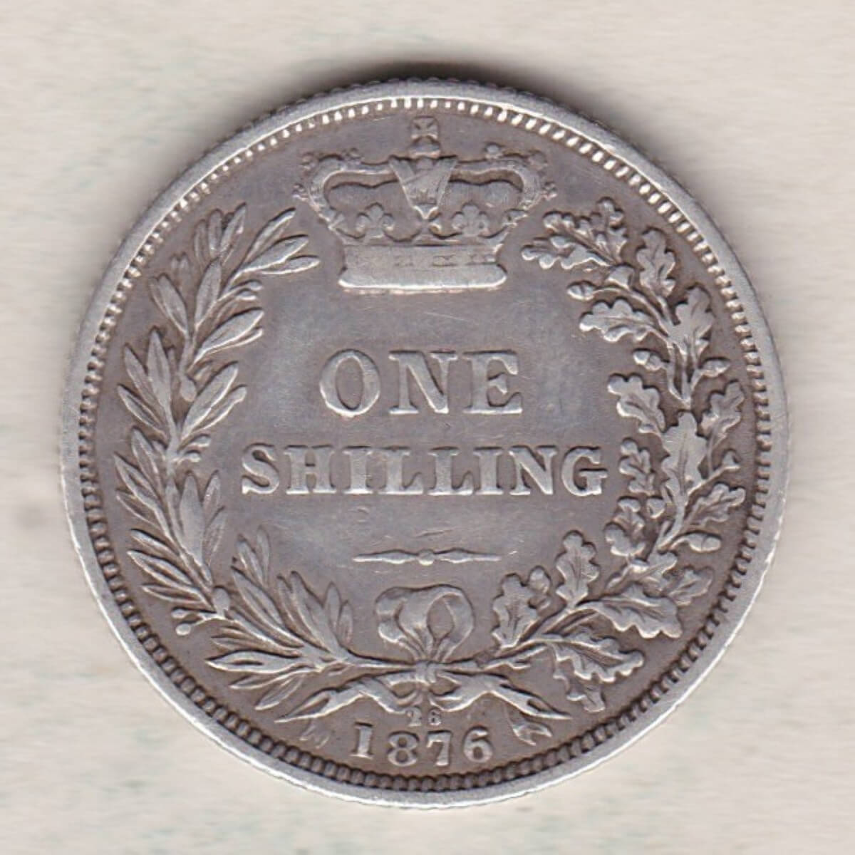 The Young head Shilling is a coin struck in 0.925 silver by the Royal Mint. This third type of the Young head design of Queen Victoria was used on the Obverse of the Shilling between 1867 and 1879. The Reverse of this coin depicts a crown, laurel and oak leaves within an open wreath, and the words “ONE / SHILLING” and “1876” with die number 26 above the date.