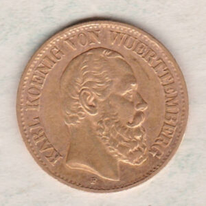 This 1878 German gold coin has the F – Freudenstadt mint. The obverse features the bust of Karl I facing right, with legend around and mint mark below. The reverse features the crowned imperial eagle, with the denomination below and date around.