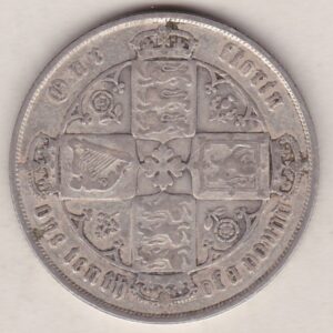 The 1878 florin is a coin struck in 0.925 silver by the Royal Mint. The Obverse features a crowned bust of Queen Victoria with long hair in a braid. She is wearing a dress embroidered with roses, thistles, and shamrocks, the national plant symbols of England, Scotland, and Ireland. The inscription around the coin is in a medieval gothic style font in upper and lower case, which was unusual for the time.