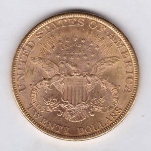 The 1878 gold twenty dollar coin was minted in Philadelphia and is also known as the Coronet Liberty double eagle. The Obverse features a left-facing coronet head of Lady Liberty surrounded by 13 stars and the date below her neck. The coronet is inscribed with the word “Liberty”. The Reverse design has an eagle with a shield on its chest, the motto “In God We Trust” encircled by stars, and the denomination “Twenty Dollars” along the bottom edge