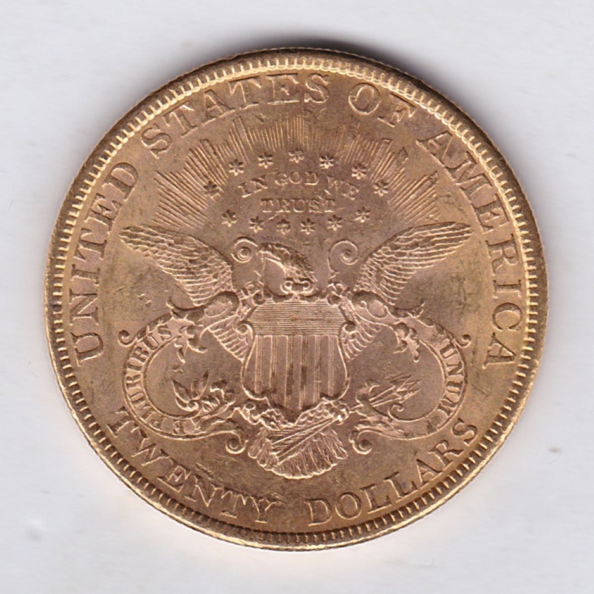 The 1878 gold twenty dollar coin was minted in Philadelphia and is also known as the Coronet Liberty double eagle. The Obverse features a left-facing coronet head of Lady Liberty surrounded by 13 stars and the date below her neck. The coronet is inscribed with the word “Liberty”. The Reverse design has an eagle with a shield on its chest, the motto “In God We Trust” encircled by stars, and the denomination “Twenty Dollars” along the bottom edge
