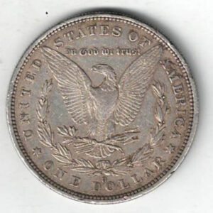 The 1879 O silver dollar coin was minted in New Orleans and is also known as the Morgan Dollar. Both the Obverse and Reverse were designed by George Thomas Morgan. The Obverse features the bust of liberty facing left, wearing a cap and crown, with flowers in her hair and stars around the border. The text on the obverse reads “Liberty; E Pluribus Unum” with the date below. The reverse features an eagle holding arrows and an olive branch, within wreath.