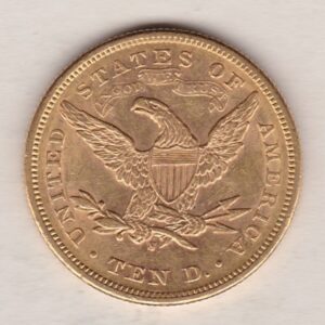 The 1879 gold ten dollar coin was minted in San Francisco. Christian Gobrecht designed both the obverse and reverse. The obverse features a bust of Liberty surrounded by 13 stars and the date below the neck. The reverse depicts an eagle holding arrows and an olive branch, with the inscriptions “UNITED STATES OF AMERICA” and “TEN D” surrounding it. A scroll above the eagle’s head displays a new motto.