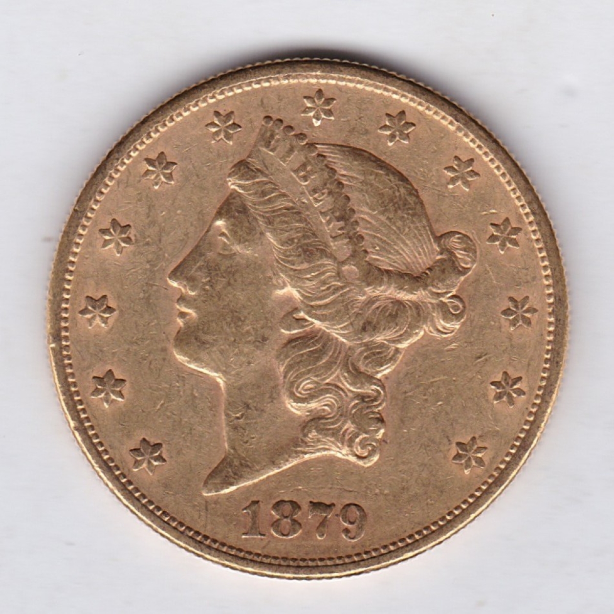 The 1879 S USA gold Twenty Dollars coin was struck in San Francisco and had a mintage of 1,223,800.