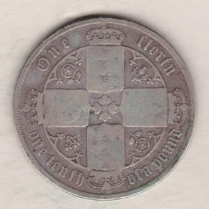 1879 Silver Gothic Florin Coin. The Obverse features a crowned bust of Queen Victoria. The Reverse features a shield with denomination.1879 Silver Gothic Florin – Queen Victoria