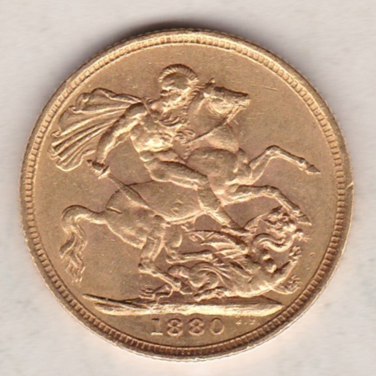 The 1880 sovereign was struck in 22 carat gold. The obverse features the young portrait of Queen Victoria facing left. The reverse depicts St George slaying the dragon, with the date in exergue.
