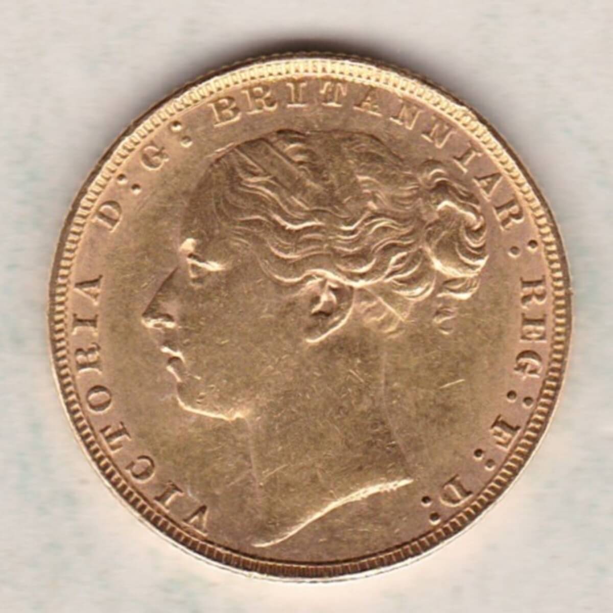 The 1880 sovereign was struck in 22 carat gold. The obverse features the young portrait of Queen Victoria facing left. The reverse depicts St George slaying the dragon, with the date in exergue.