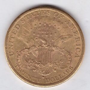 The 1880 gold twenty dollar coin was minted in San Francisco and is also known as the Coronet Liberty double eagle. The Obverse features a left-facing coronet head of Lady Liberty surrounded by 13 stars and the date below her neck. The coronet is inscribed with the word “Liberty”. The Reverse design has an eagle with a shield on its chest, the motto “In God We Trust” encircled by stars, and the denomination “Twenty Dollars” along the bottom edge. The S – San Francisco mint mark can be found between the shield and the denomination.