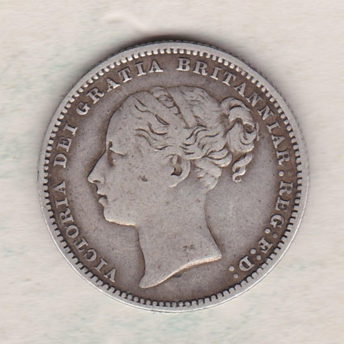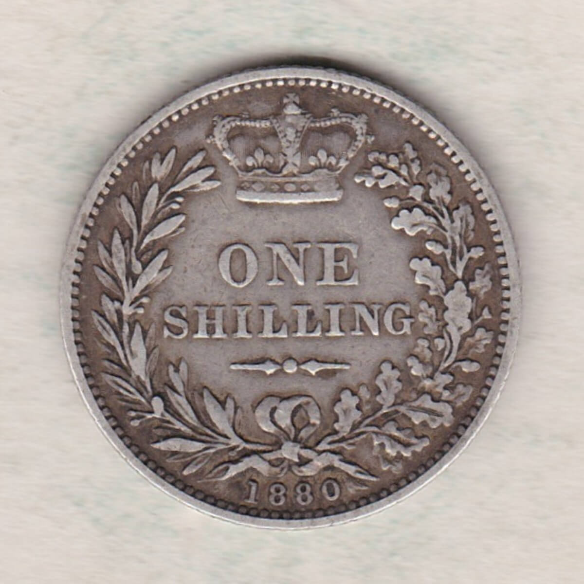 1880 silver shilling coin featuring Queen Victoria young head on the Obverse. The Reverse has a crown, laurel and oak leaves within an open wreath.1880 Silver Shilling Coin – Victoria Young Head